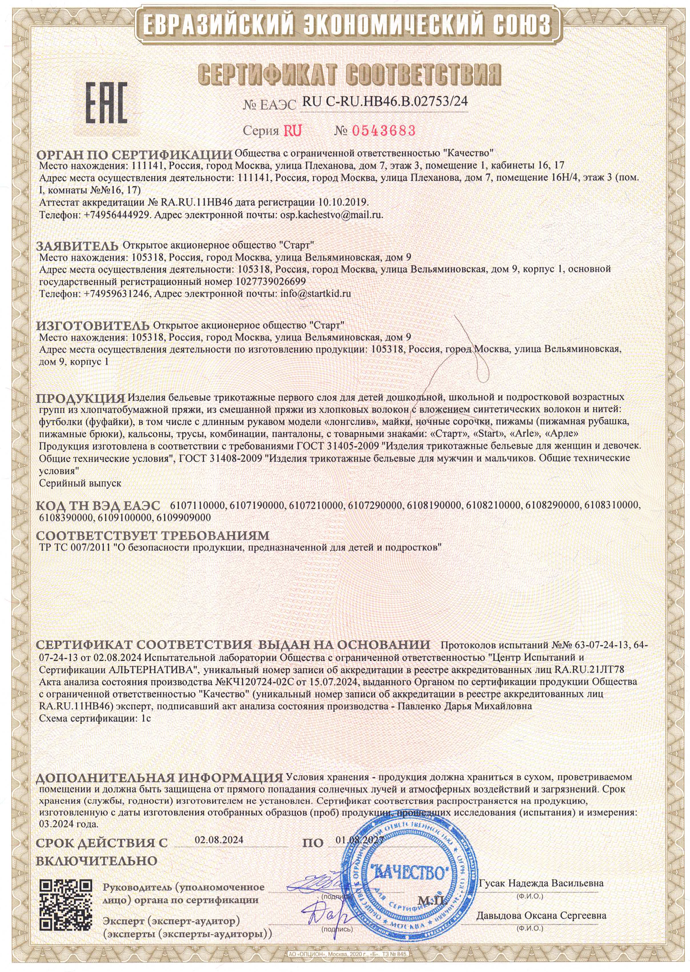 Вещи торговой марки «Старт» сделаны из высококачественного материала, который гарантирует долгий срок службы. Абсолютно все комплектующие соответствуют международным нормам и безопасны для человека и природы. Дополнительным доказательством тому служит международный сертификат Oeko-Tex Standard 100. который «Старт» получил в 2012.
